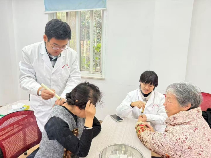 活动现场根据服务内容划分为四个区域:血压测量区、血糖检测区、中医推拿区和艾灸理疗区。共八名志愿者参与服务,每个项目各配备两名志愿者。在血压测量与血糖检测区,志愿者为居民进行基础健康筛查,并记录相关数据;在中医推拿区,志愿者运用专业手法帮助缓解肌肉疲劳;在艾灸理疗区,志愿者向居民展示了传统中医外治方法。
