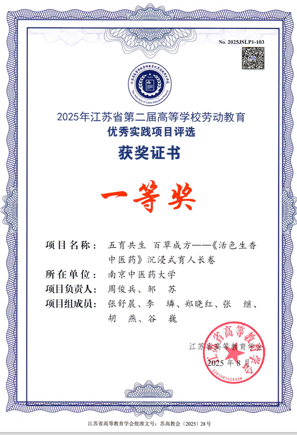 在2025年江苏省第二届高等学校劳动教育优秀实践项目评选中,我院周俊兵副教授与马克思主义・医学人文学院邹苏副教授领衔的团队,凭借《五育共生百草成方——〈活色生香中医药〉沉浸式育人长卷》项目,从全省众多申报项目中脱颖而出,荣获一等奖。这份荣誉不仅是对项目创新性与实效性的高度认可,更彰显了团队教师“以劳育人、以德育心”的深厚师德。