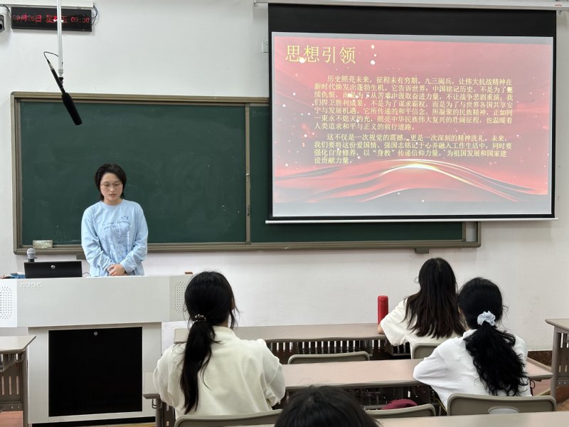 范洁同学从“时代背景”切入,系统梳理了我国国防建设的跨越式发展历程。同学们认真回顾了“九三阅兵”的盛况,深切体会到国家繁荣昌盛的来之不易。整齐的方阵、铿锵的步伐、先进的装备,不仅展现了人民军队的威武雄姿,更昭示着一个走向复兴的民族对和平发展的坚定承诺。这场阅兵,既是对革命先辈的崇高致敬,也是对共和国生日的最好献礼。
