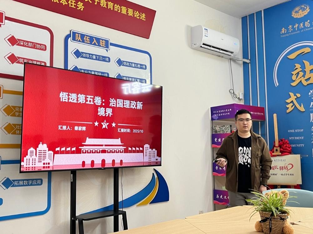 活动伊始,中医学院橘井先锋党支部书记秦家辉同志带领支部成员围绕《习近平谈治国理政》第五卷展开系统学习。党课以“五卷贯通”视角梳理理论演进脉络,从第一卷的“中国梦”提出到第五卷的“中国式现代化”蓝图,重点解读了高质量发展、新质生产力、全过程人民民主等核心要义。