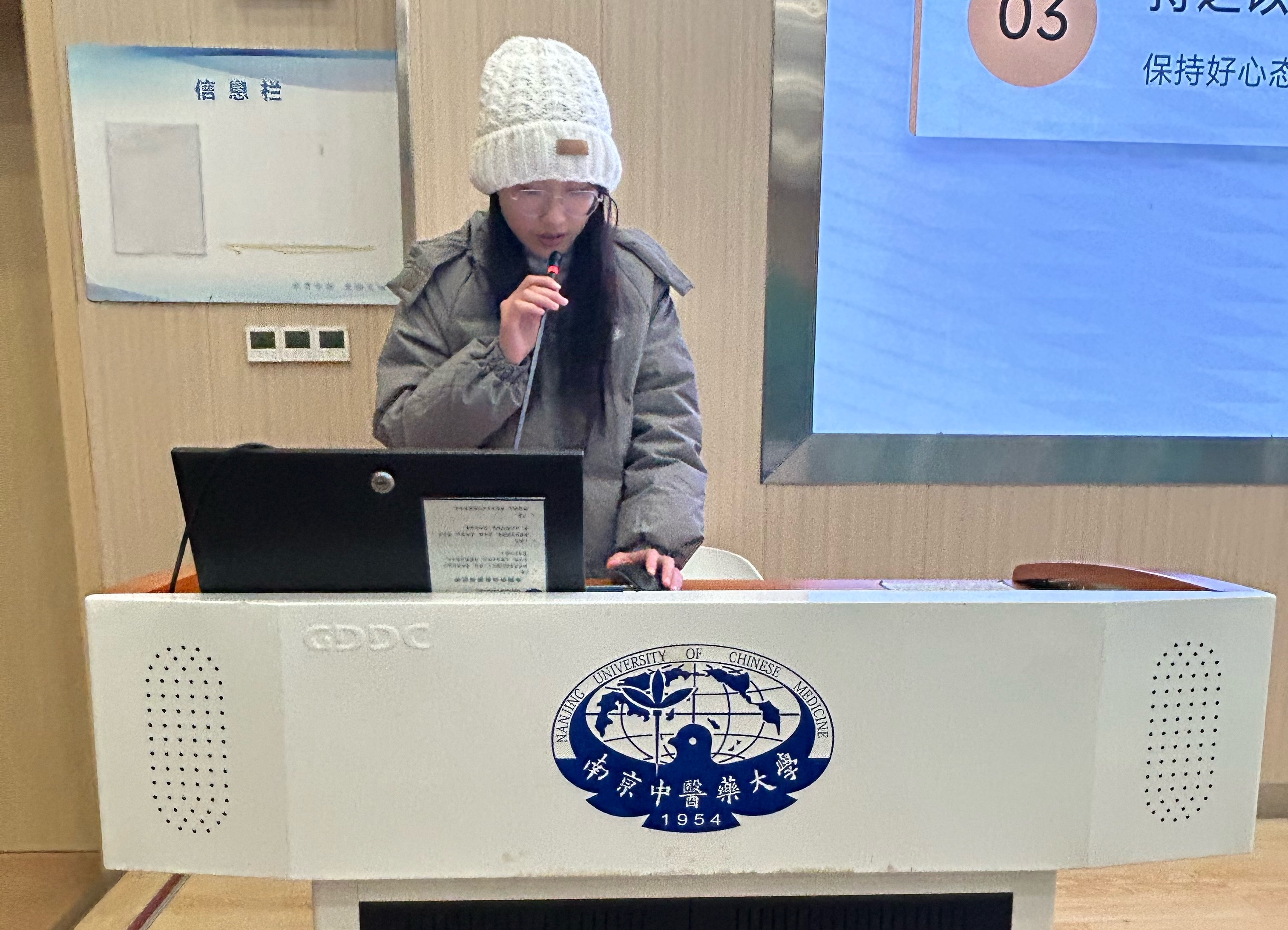 中医(定向)232班王怡文同学主讲的《针灸学》在3月3日的中午12:30举行。她结合经络循行规律,分享了腧穴定位的简便记忆技巧,并针对常见考点进行讲解,帮助同学们在温习中查漏补缺、巩固提升。