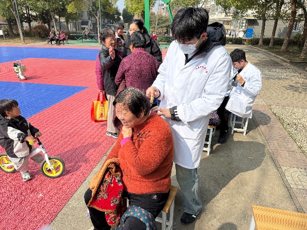 上午九时,活动在闻兰苑社区广场准时展开。志愿者们迅速布置好服务区域,推拿、血压测量、艾灸、耳穴埋籽等项目有序进行。推拿区内,同学们手法娴熟,耐心帮助居民舒缓疲劳;血压测量点前,志愿者们细致记录数据,并普及日常保健知识;艾灸与耳穴埋籽体验区人头攒动,居民们在亲身体验中感受中医药的独特魅力。