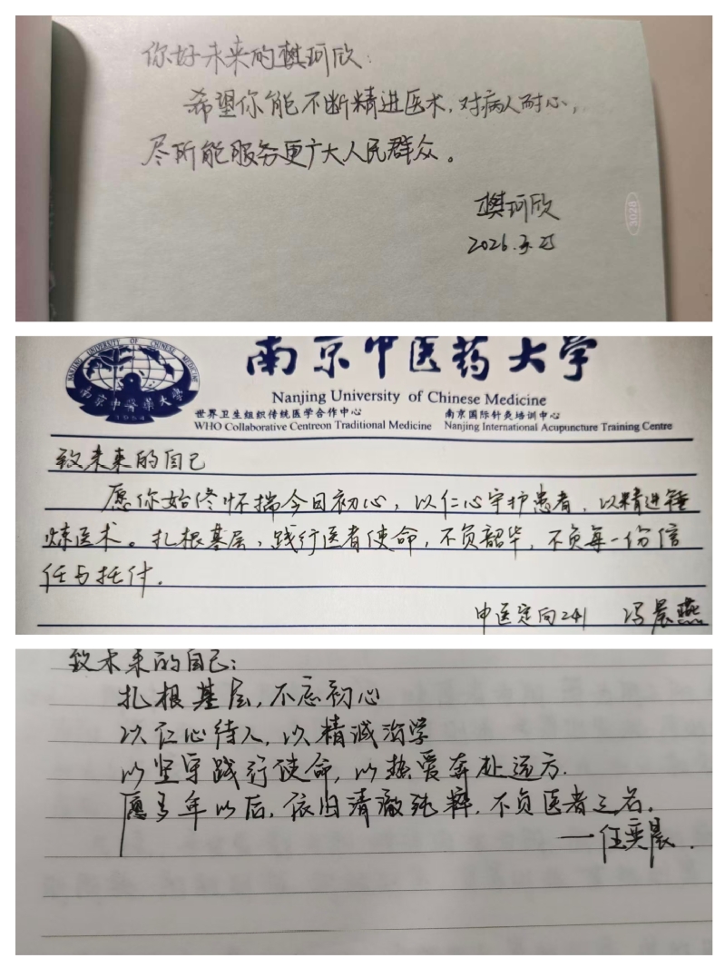 全体团员在纸上各自写下了自己对未来基层从医的期许。他们有的立志精研岐黄之术,以大医精诚的追求守护百姓安康;有的希望成为基层一颗螺丝钉,以敬业奉献的热忱扎根乡土;有的憧憬秉持服务基层的初心,让中医智慧在基层焕发光华。